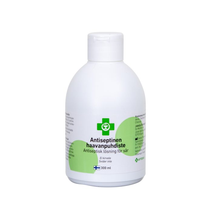 Antiseptisk lösning som inte svider, för rengöring av små sår, skråmor och brännskador. Innehåller pantenol som vårdar huden. Tillverkad i Finland.
