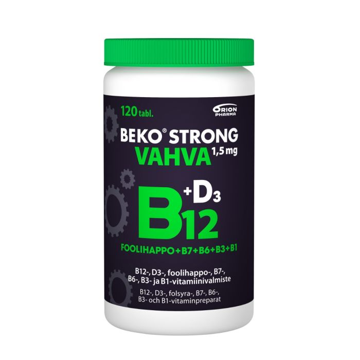 Beko Strong B12 VAHVA 1,5 mg on on markkinoiden vahvin ja monipuolisin* B12-vitamiinivalmiste muistin, hermoston, jaksamisen sekä vastustustuskyvyn tueksi. 1 pienikokoinen ja helposti nieltävä tabletti sisältää 1,5 mg B12-vitamiinia, 20 mikrog. D3-vitamiinia sekä lisäksi vahvan annoksen viittä päivittäin tarvittavaa B-vitamiinia.