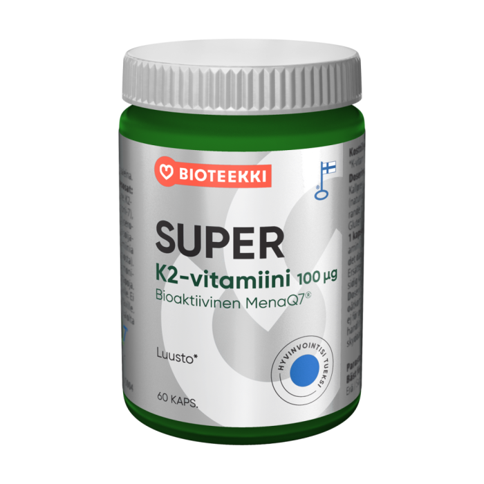 Bioteekin Super K2-vitamiini on vahva ja hyvin imeytyvä K2-vitamiini öljykapselissa. Valmiste sisältää luontaista menakinoni-7-vitamiinimuotoa kylmäpuristetussa pellavansiemenöljyssä. Kapselin sisältämä öljy edistää rasvaliukoisen K-vitamiinin imeytymistä, mistä johtuen K-vitamiinin imeytyminen on tehokasta