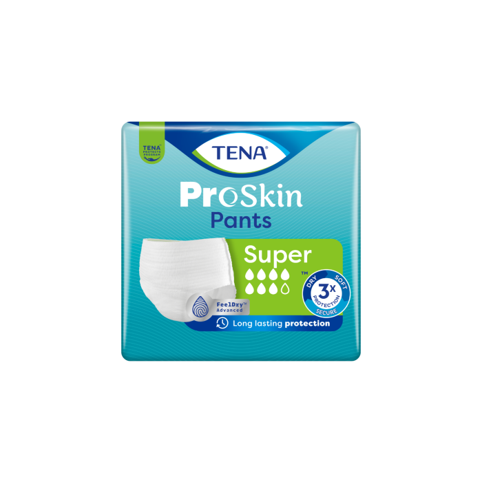 TENA ProSkin Pants Super inkontinenssibyxor skyddar upp till 100 % mot måttlig till svår urinläckage. De absorberar snabbt vätskan och håller huden torr länge, dag som natt. Pålitliga engångsbyxor för en aktiv vardag för både kvinnor och män.