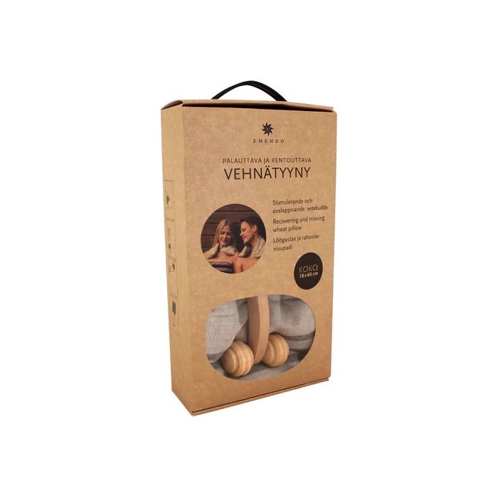 Emendon lämmitettävä vehnätyyny on helppokäyttöinen ja luonnollinen apu jäykille hartioille ja lihaksille. Lämmitä tyynyä muutama minuutti mikrossa (aseta mikroon lämmityksen ajaksi vesilasi puolillaan kylmää vettä) tai uunissa (käärittynä folioon), aseta jännittyneeseen kohtaan ja rentoudu. Voidaan käyttää myös kylmähoitona. Hyvää oloa tyylikkäässä pakkauksessa itselle tai lahjaksi!